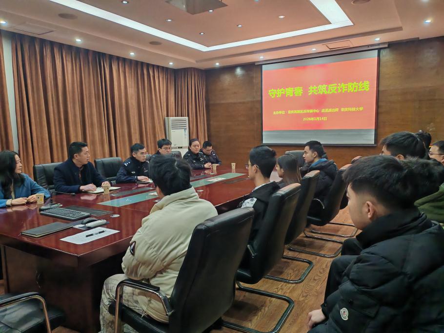 1月14日上午,“守护青春·共筑反诈防线”座谈交流会暨学习先锋颁奖仪式在校园安稳指挥中心会议室举行。重庆高新区反诈中心、虎溪派出所,学校保卫处、学生处负责人及10余名学生代表参会,警校携手为校园反诈“再上一道锁”。