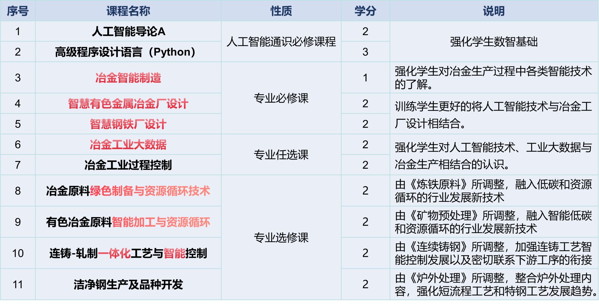 重构课程体系,实现“课程融智”。紧扣冶金智能化需求,将工业大数据、数字孪生、智能控制等技术深度嵌入课程全流程。在基础层:增设《人工智能导论》、《高级程序设计语言(Python)》等通识必修课,为学生配置数智时代的“入场券”。在融合层:开设《冶金智能制造》、《智慧钢铁厂设计》、《冶金工业大数据》等交叉课程,训练学生解决复杂工程问题的综合素养。在升级层:对《炼铁原料》、《矿物预处理》等“老牌”专业课进行数字化迭代,融入低碳智能与短流程工艺,让传统课堂焕发出科技感十足的新活力。