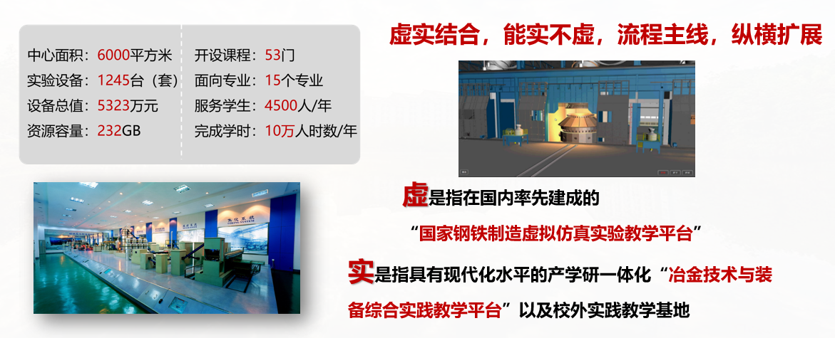 目前,平台设备总值超过5300万元,中心占地面积6000平方米,拥有实验设备1245台(套),数字化资源容量达232GB。这组庞大的数据背后,是强有力的教学输出:平台目前已开设53门深度融合课程,覆盖15个相关专业,年服务学生约4500人,完成总学时数高达10万人时数/年。其中,国家级钢铁制造虚拟仿真实验教学平台更是成为该专业展示改革成效的一张亮丽名片。