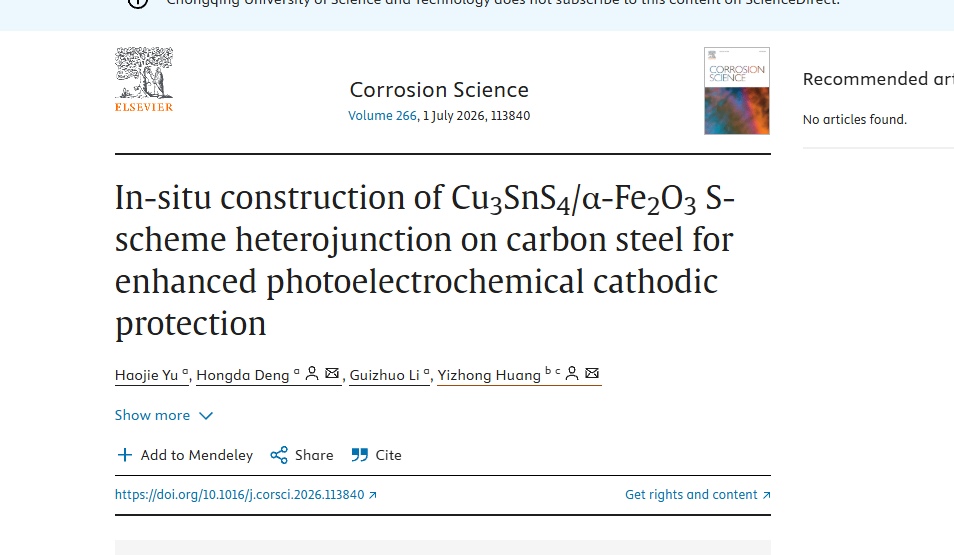 近日,我校冶金与动力工程学院2023级资源与环境专业硕士研究生余浩杰,以第一作者身份在材料科学领域权威国际顶尖期刊《Corrosion Science》发表高水平学术论文。论文题为《In-situ Construction of Cu3SnS4/α-Fe2O3S-scheme Heterojunction on carbon steel for Enhanced Photoelectrochemical cathodic Protection》,我校为第一完成单位,邓洪达、黄一中教授为共同通讯作者。